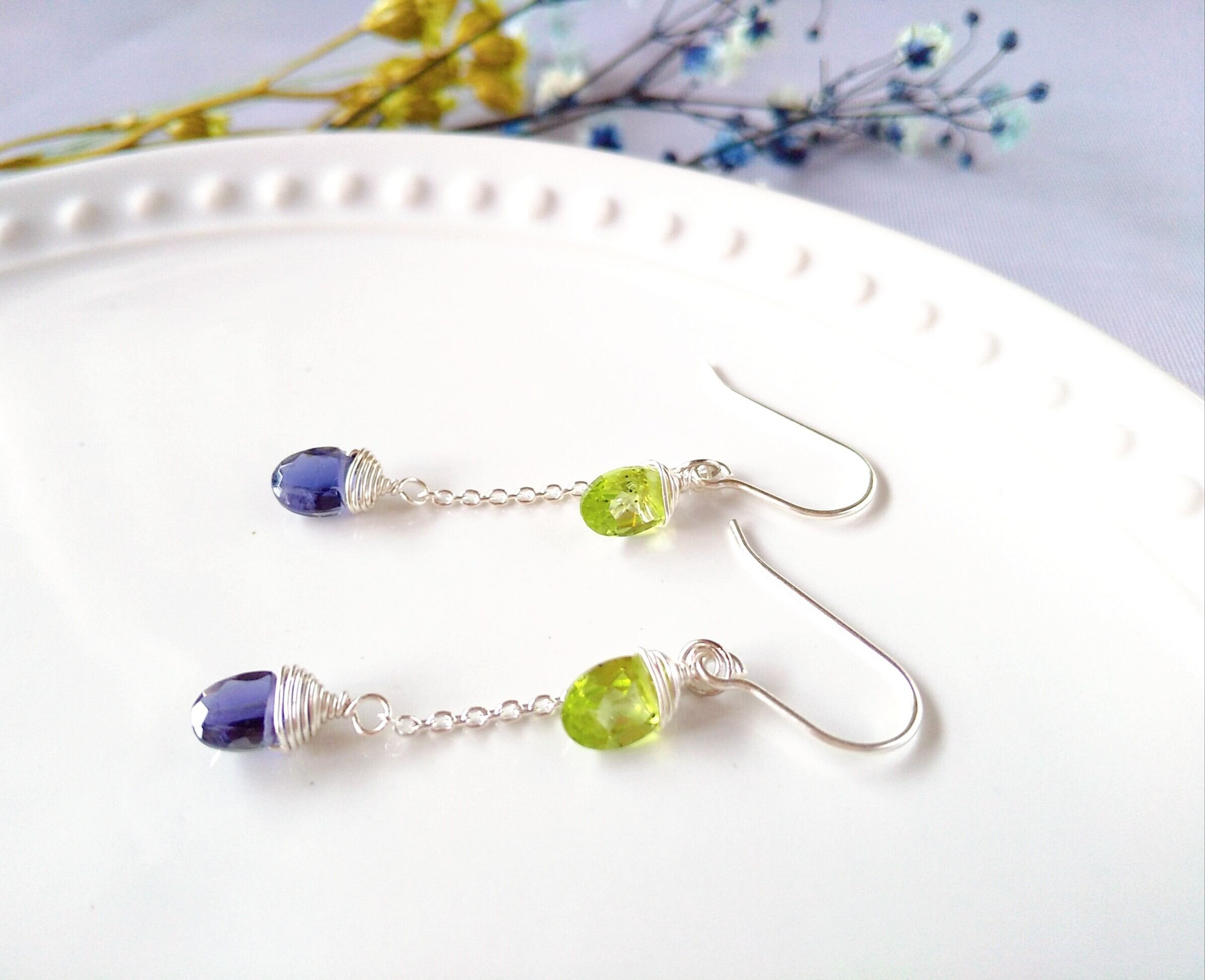 深い夜のような青紫色のアイオライトと、太陽のエネルギーに満ちた鮮やかな黄緑色のペリドット。