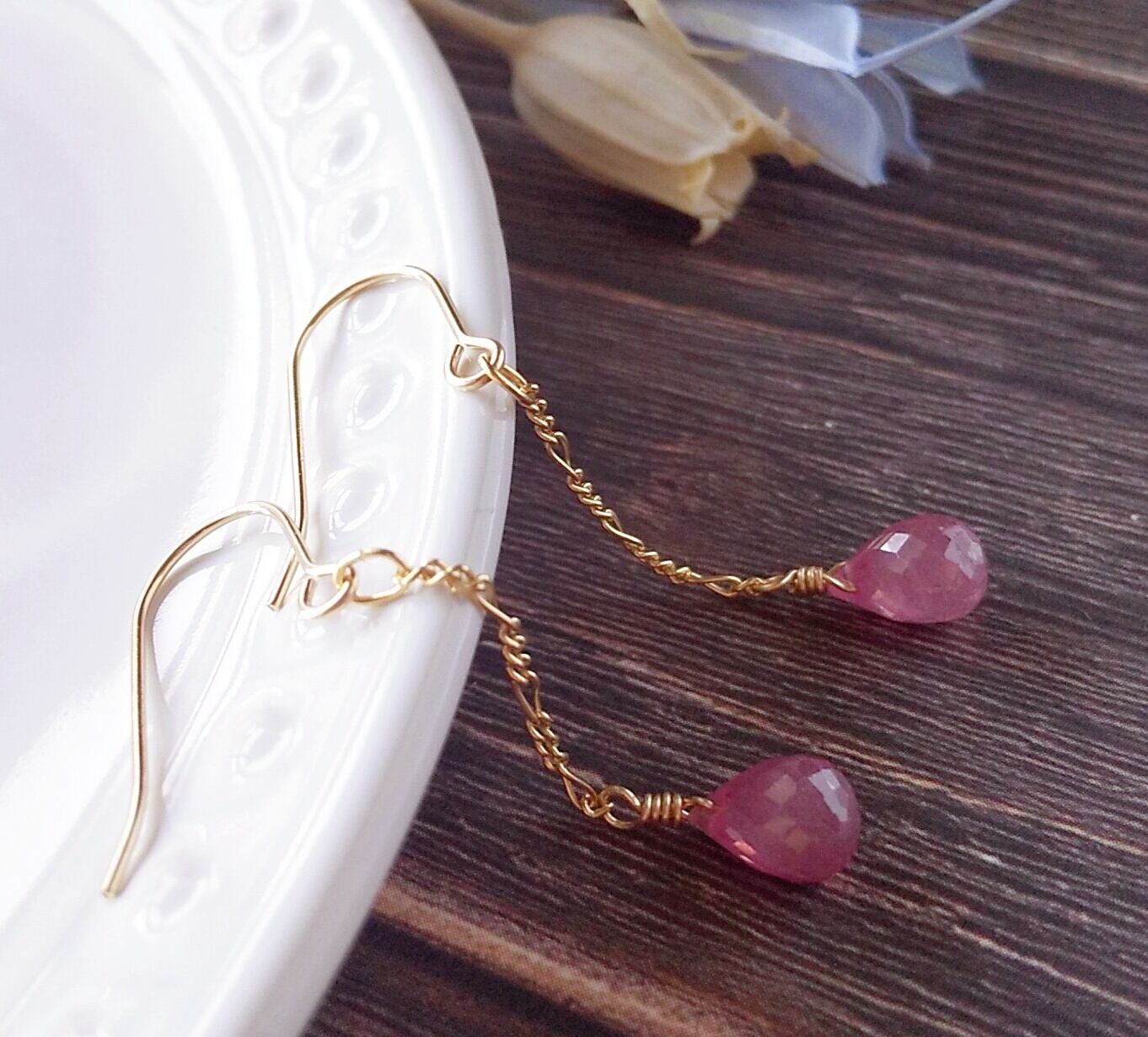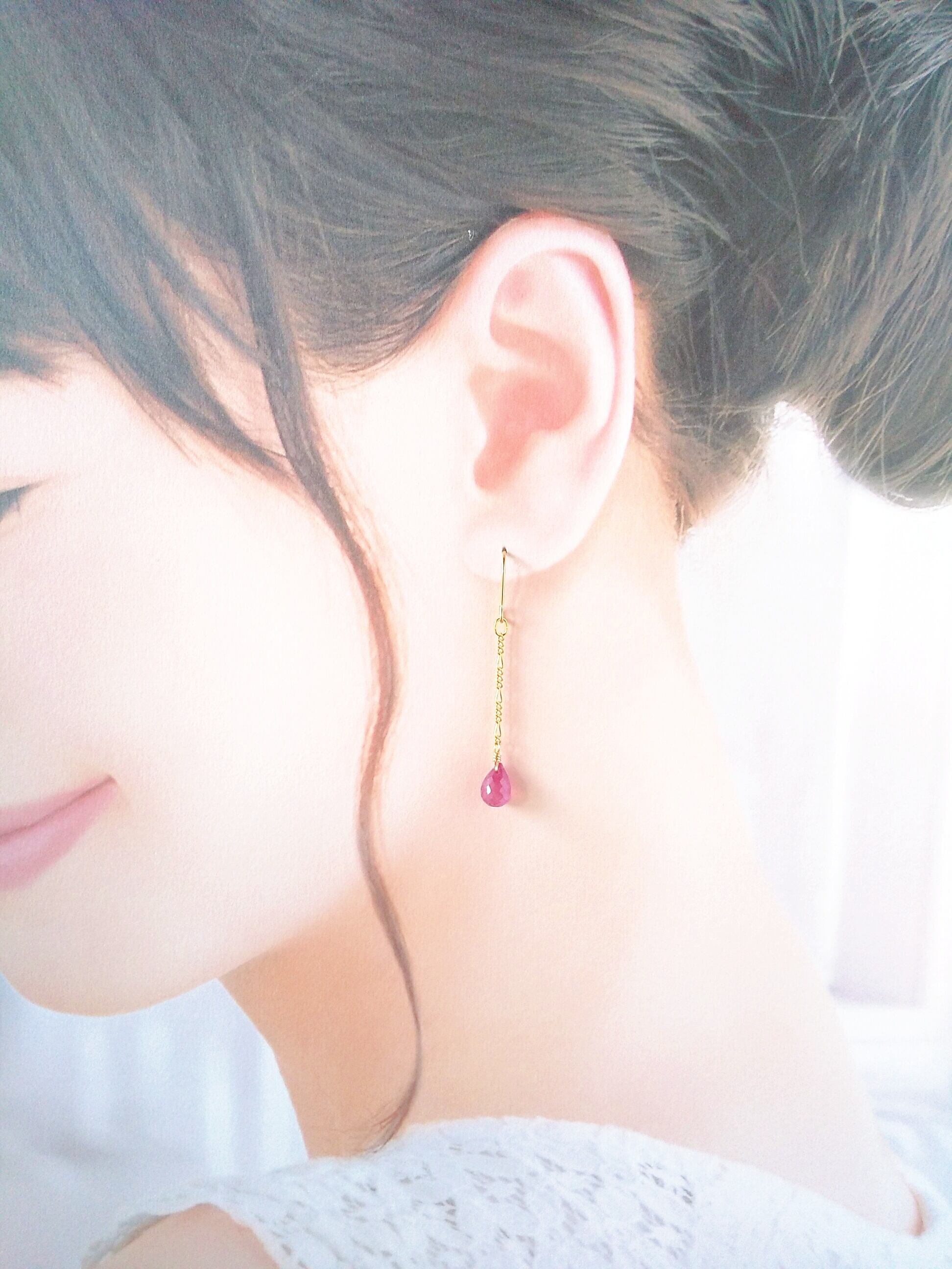 美しいブリオレットカットが施された情熱的な真紅色のルビーに、繊細でエレガントなフィガロチェーンを合わせた14kgfピアスです。