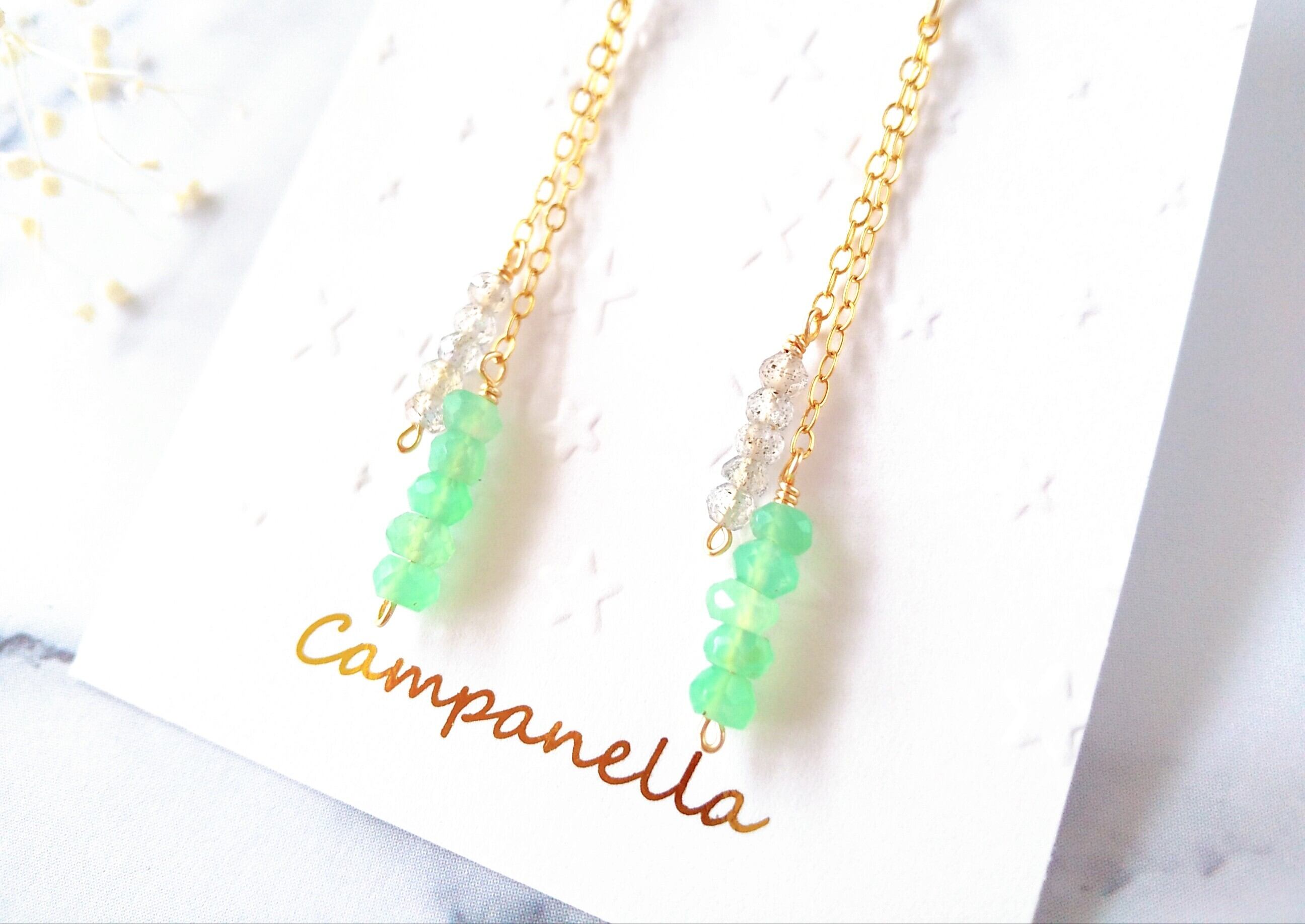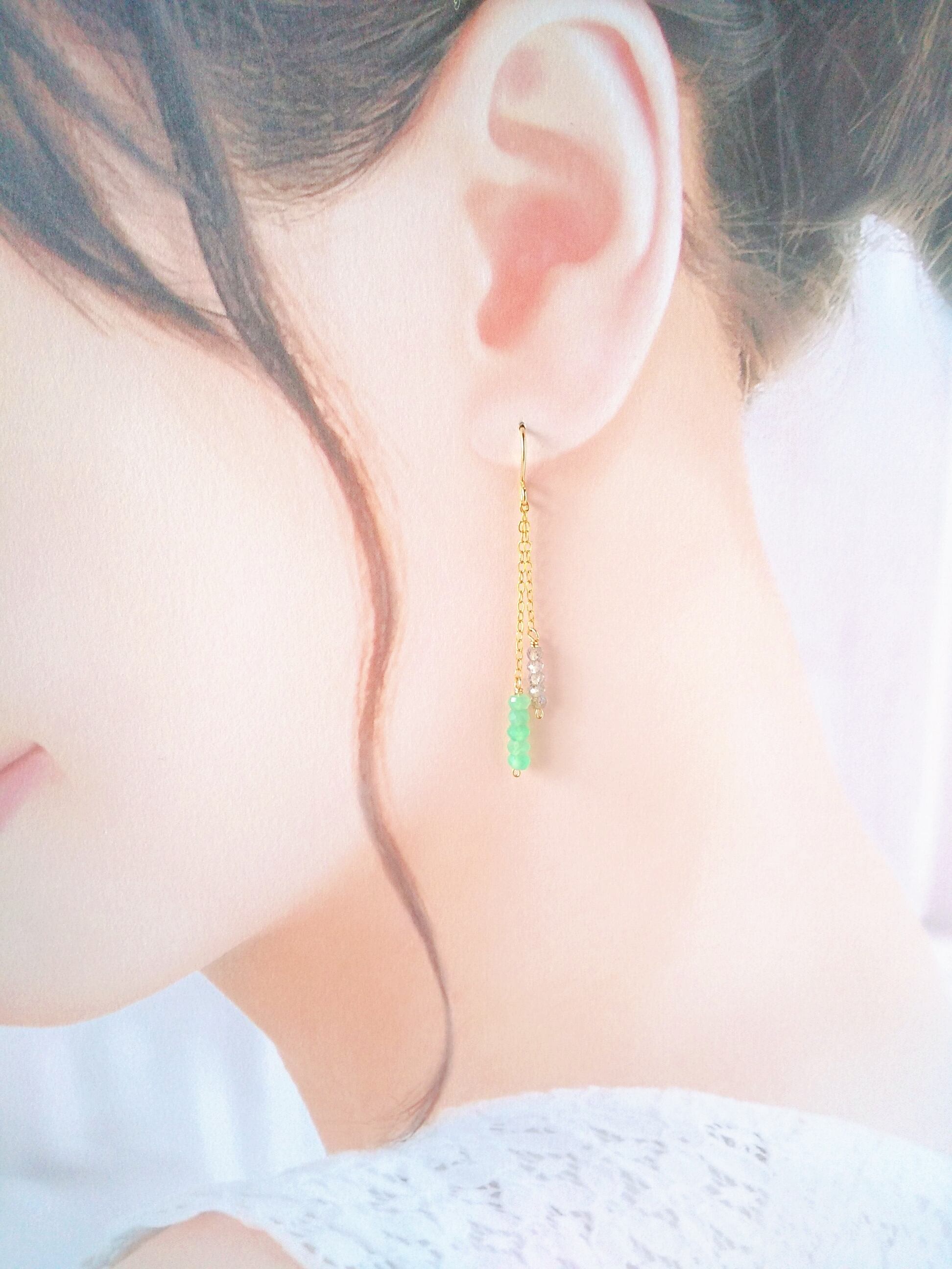 アップルグリーンが爽やかなクリソプレーズと、神秘的な輝きを放つラブラドライトをチェーンで繋いだ14kgfピアスです。