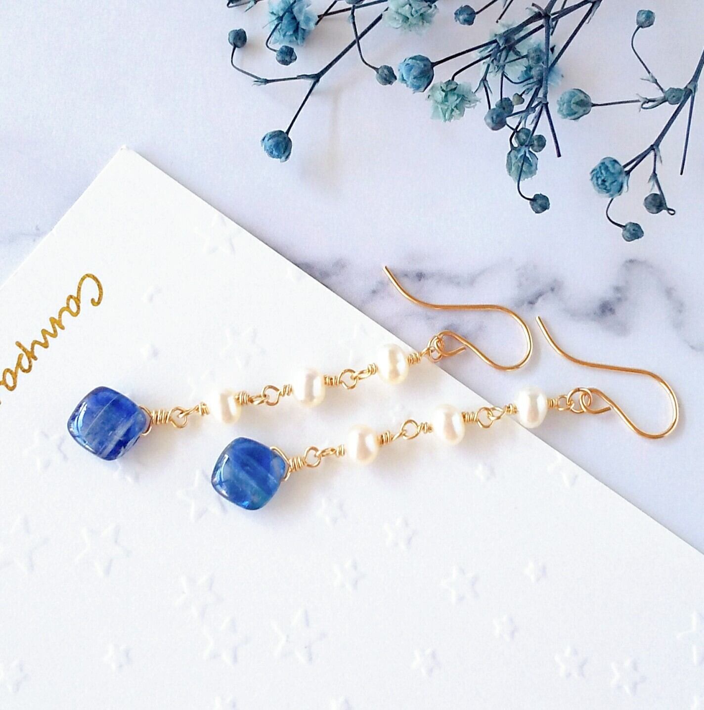 透明ブルーのカイヤナイトと、優しいホワイトの淡水パールを組み合わせ、エレガントに揺らめくピアスを作りました。